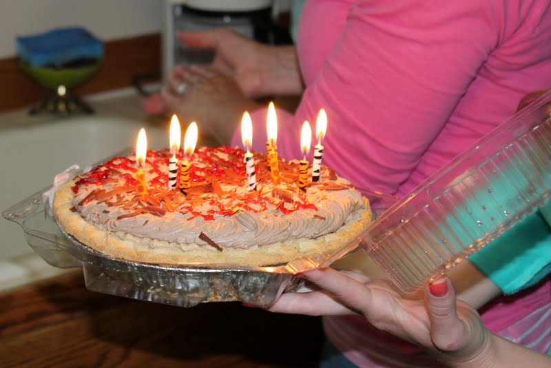 The last thing we did before packing up and heading home was to celebrate Carson's mom's birthday. She kept saying that she didn't want to do anything, but I don't see how that's possible (I LOVE birthdays), so we did something small. We went out to rent a movie and returned with a Kahlua Cream pie, animal print candles (a perfect find) and decorating icing. I don't have a career in cake writing, but it's legible.